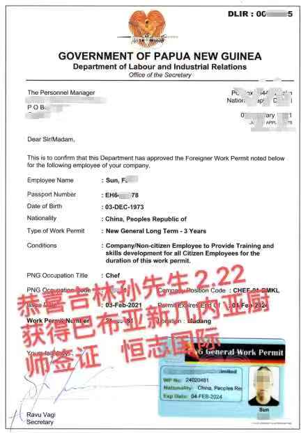 恭喜吉林孙先生获巴布亚新几内亚厨师签证